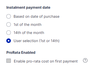 If you are allowing Direct Debit payments you will be able to select the 'Instalment payment date', as well as for deciding if you want pro-rata payments enabled.