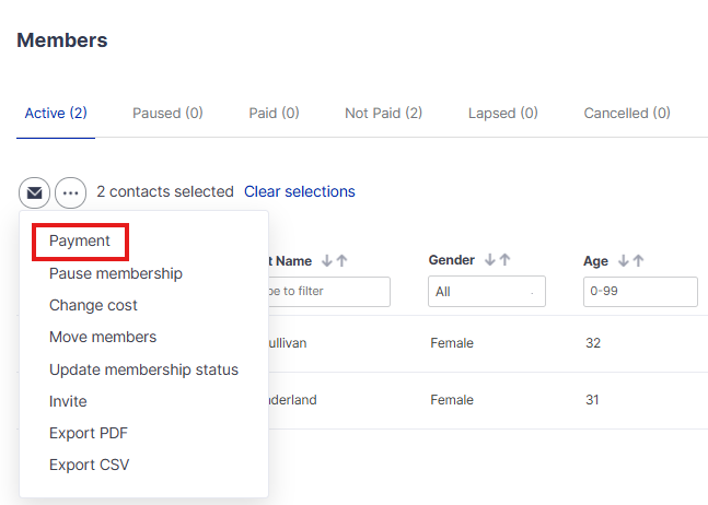 Step 1: You members are now ready to be sent a payment request. You can select all members using the checkbox next to the first name column or select individual members using the checkbox next to each of their names. Then click on the 'more' button (icon with the three dots) and select 'Payment'.