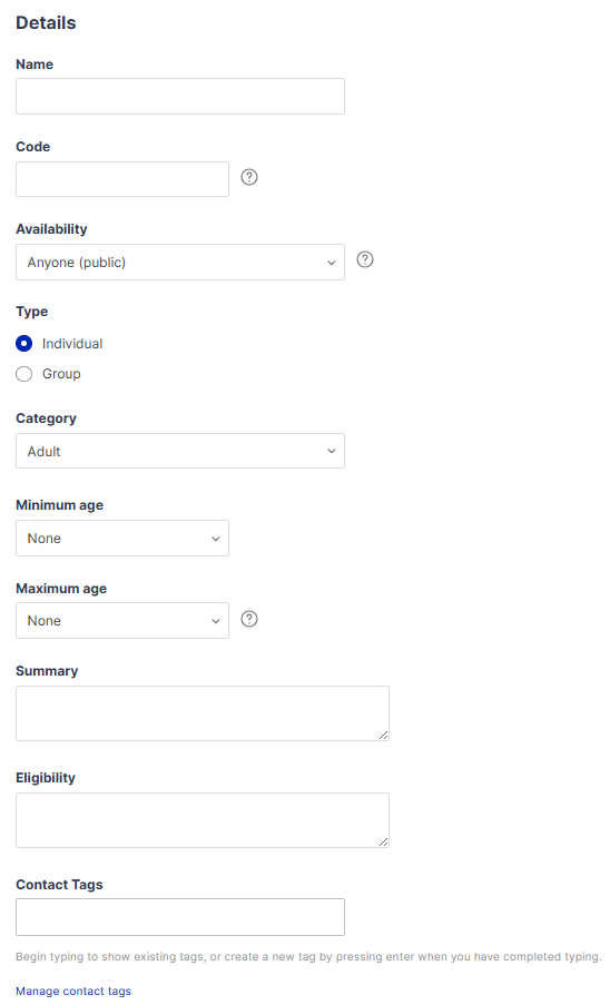 Step 2: Next fill in the details of the package. The type and category are particularly important when creating renewal packages as these must match the package you are importing from. Contact tags can also be managed from here.