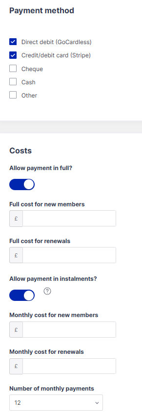 Followed by the costs and payment methods. You will be able to add a cost for new members and one for renewals. If you have a discounted price for members renewing before a certain date you can put this price in box, once the date has past to receive this discount you can edit the package with the new price. This won't effect members who have already paid just members still to renew.