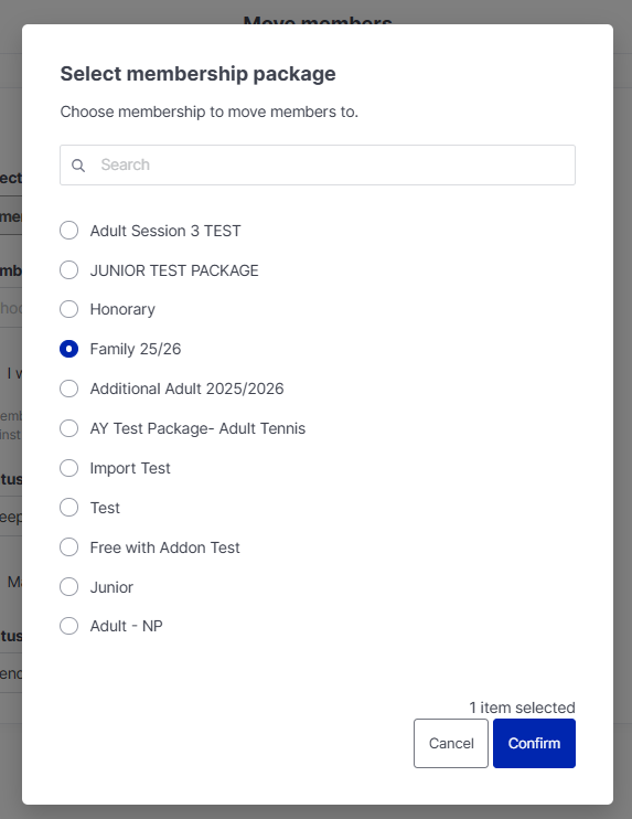 Once you've chosen the membership package you are moving the members to, click 'Confirm'.