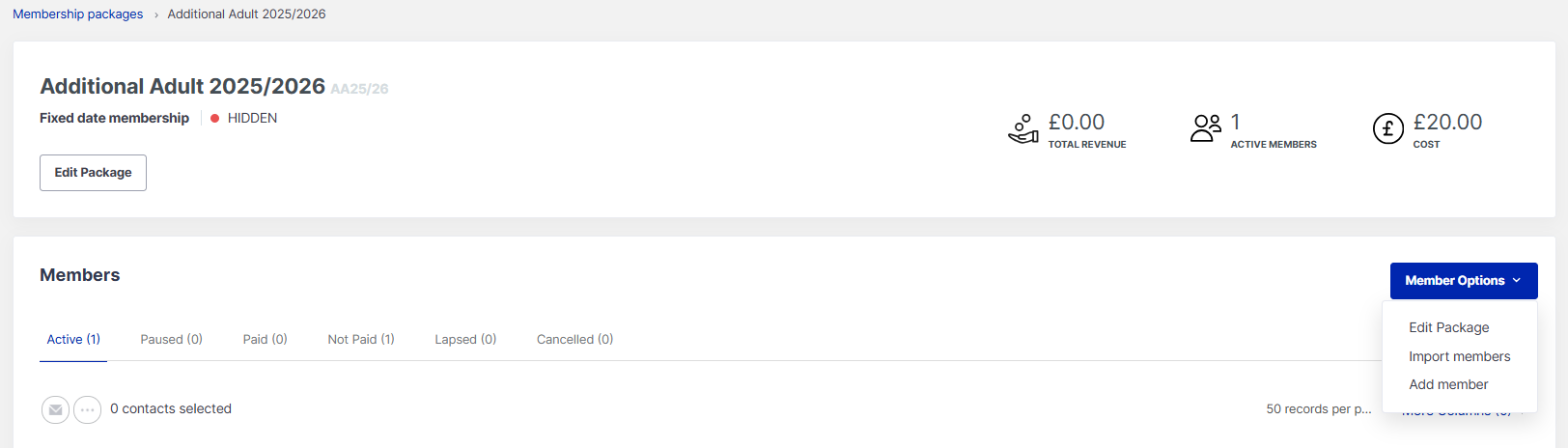 Here you will be able to edit the package's details such as the cost of the membership, which is useful if you need to change the membership cost throughout the year.
