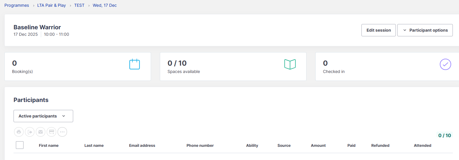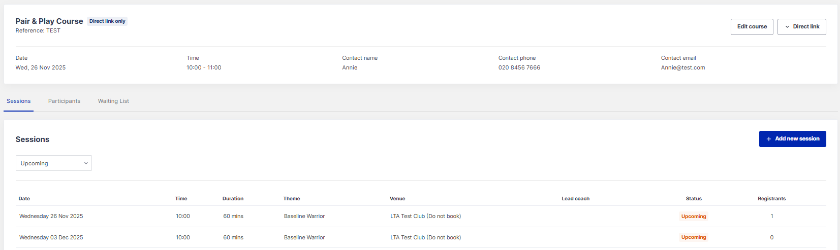 To delete a specific session from within an LTA Pair & Play course, you'll first need to head to the course itself and select the session you wish to remove.