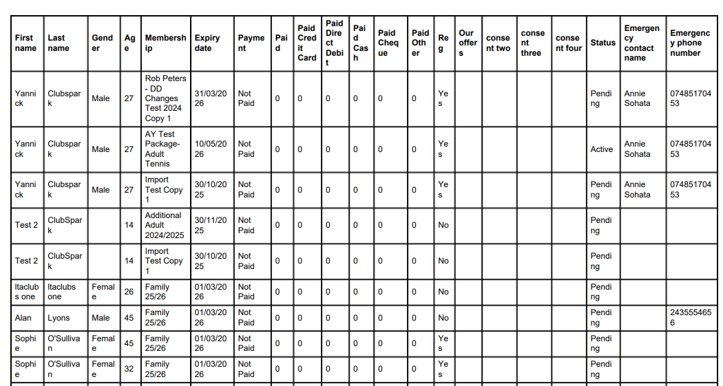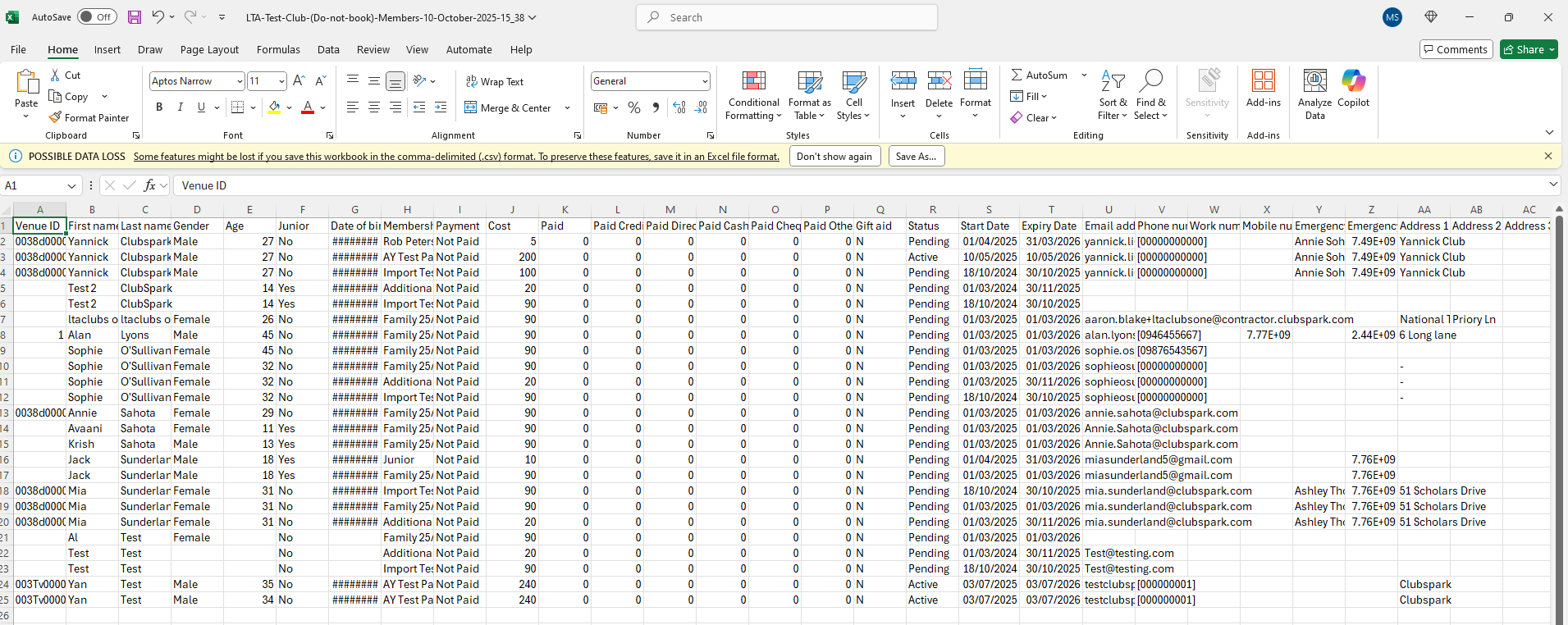 Please note: For junior and group memberships (i.e. Family packages), the 'main contact' details (name + email address) will now show on the export file.