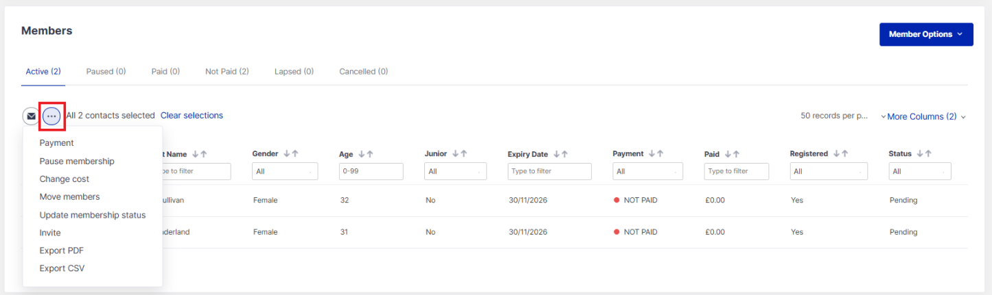 Step 2: Whether you are in a membership package or the 'View all members' section, select all the members that you would like to export by ticking the box next to the 'first name column' and then clicking on the 'more' button (icon with the three dots).