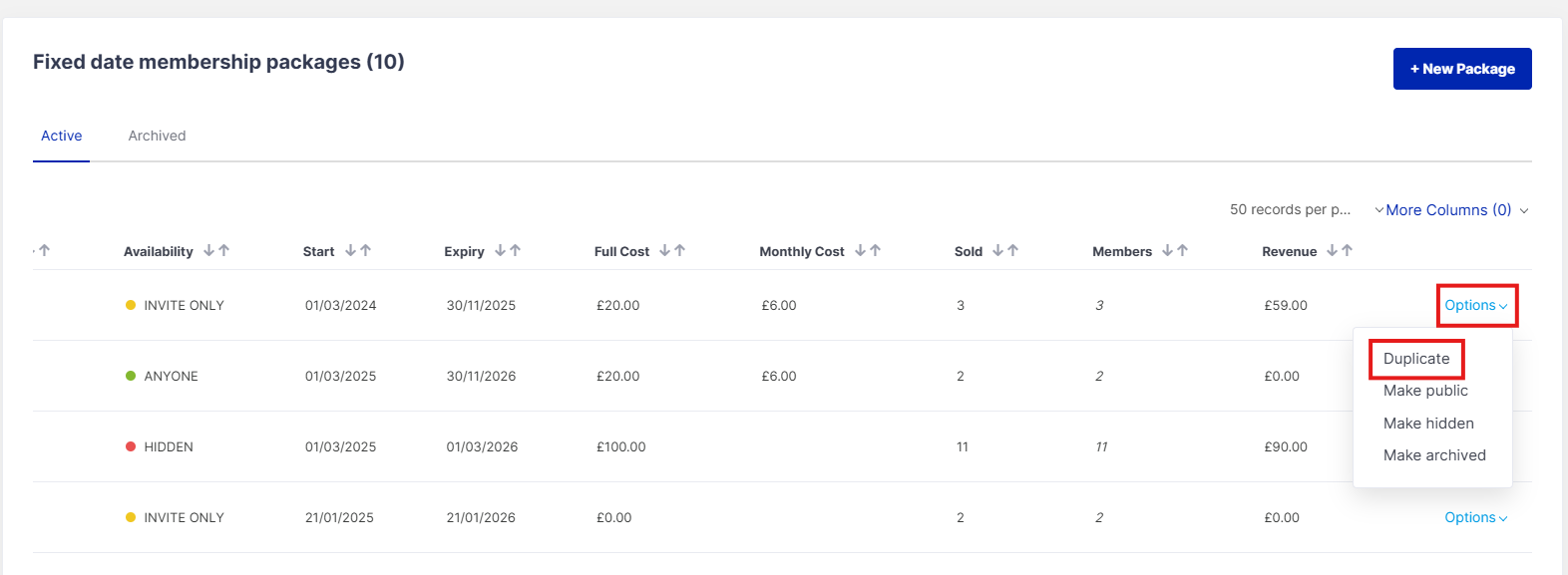 Step 1: To do this, click on the 'Options' button at the end of the package you wish to duplicate and select 'Duplicate'.