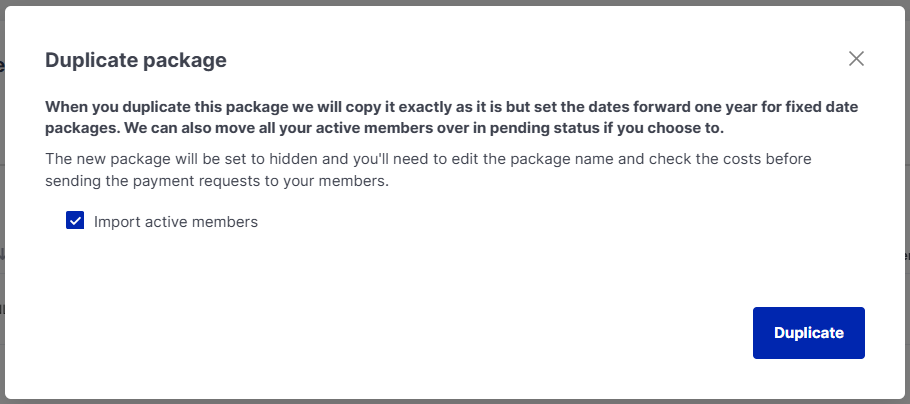 Step 2: You will then be asked if you would like import active members, this will not import those who are lapsed or cancelled so tick this option if you want the active members to be imported. Then press the blue 'Duplicate' button. Your duplicated package will have the same dates but 1 year on and the members will show as 'Pending'.