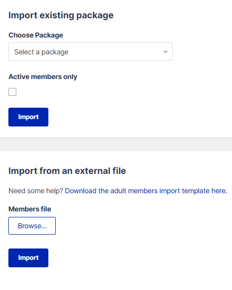 Please note: You can only import from the same membership type, for example: Adult to Adult (not Adult to Family). If you can't see the package you wish to export from here check that you have created the new package as the same 'Type' as the previous year.