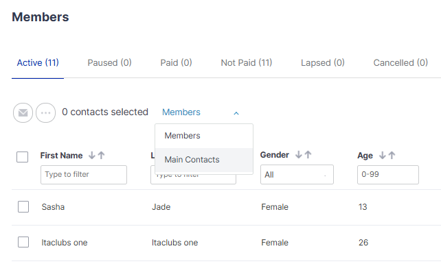 Step 5: With the members showing in the new package, you will be able to send emails to all adult members. Make sure you have selected 'Main Contacts' to send out payment requests and invites.