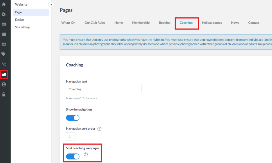 Here you'll be able to set where it displays in the navigation bar (navigation sort order) and what it displays as (navigation text). You can change it Junior Coaching or Juniors. It has to be under 15 characters.