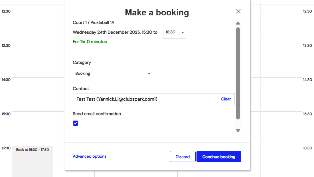 Click on the date, time and court in question to book onto and search for the player's name. You have the option to Send Email Confirmation to the player by ticking the box. Then click on Continue booking.