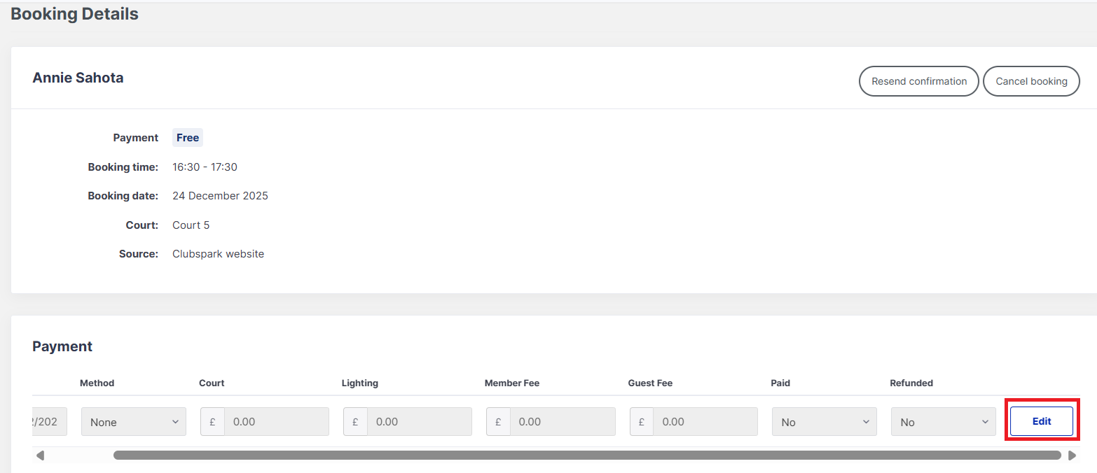 You'll be taken to the Booking Record. You'll need to scroll across to the right of the Payment Section to see the 'Edit' icon to update each field