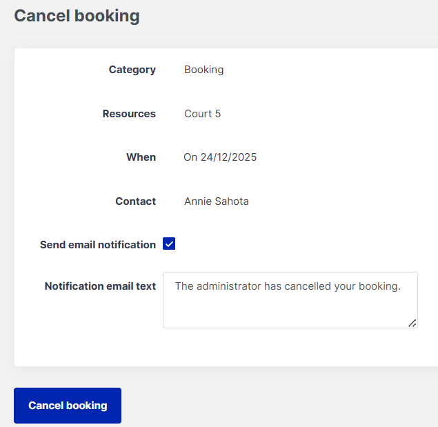 You will then be taken to the following screen. Here you have the option to send email notification by ticking the box and to adding an additional message. Then click 'Cancel Booking'