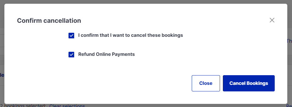 A Pop up will appear with the following options for you to tick. Then click 'Cancel Bookings'