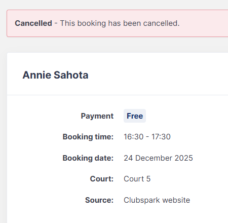 Once you have selected the booking, you will be taken to the player/member's booking details. Click 'Cancel Booking'