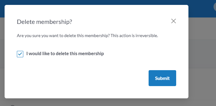 Step 4: As in our example above, the member has not yet paid, so you can go ahead and click on the blue 'Delete membership' button in the top right. The following text box will appear, tick the box to confirm you would like to delete the membership, then click on the blue 'Submit' button.