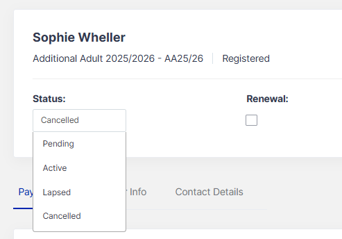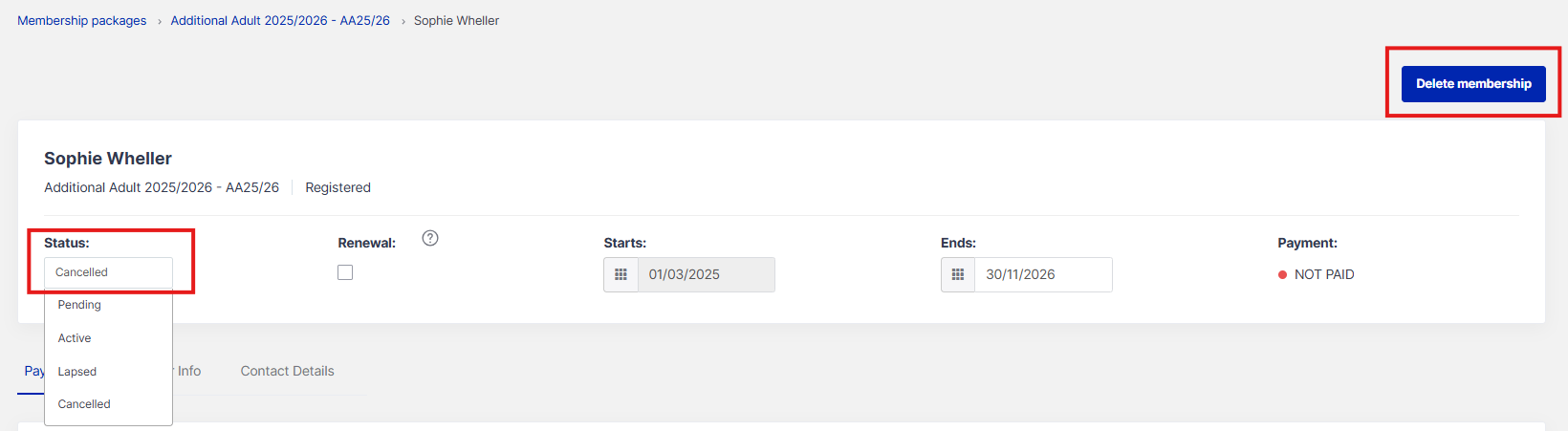 Please note: If this box is 'grey' in colour, this means there is a payment on the membership record and you won't be able to delete it. You can however change the status to 'cancelled' so the membership doesn't appear as an 'active' membership anymore.