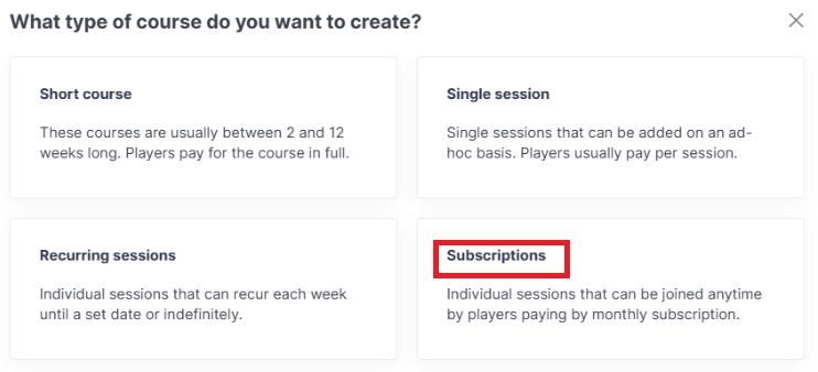 This guide walks you through setting up a coaching subscription course, including pricing, payment options, and what players will see on the public-facing booking page.