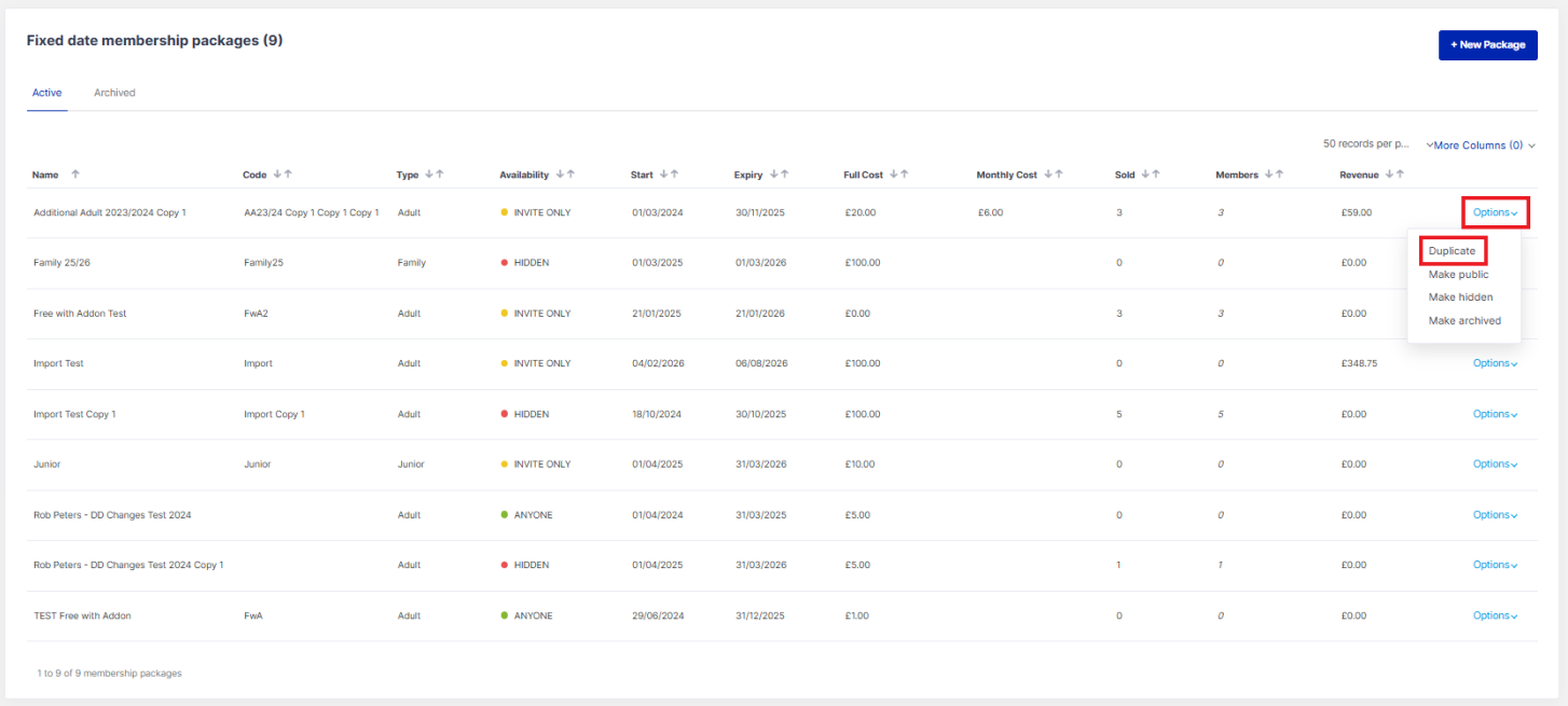 Step 3: The 'Duplicate' function is found by clicking on the blue 'Options' button to the right of the membership package - shown in the image below.