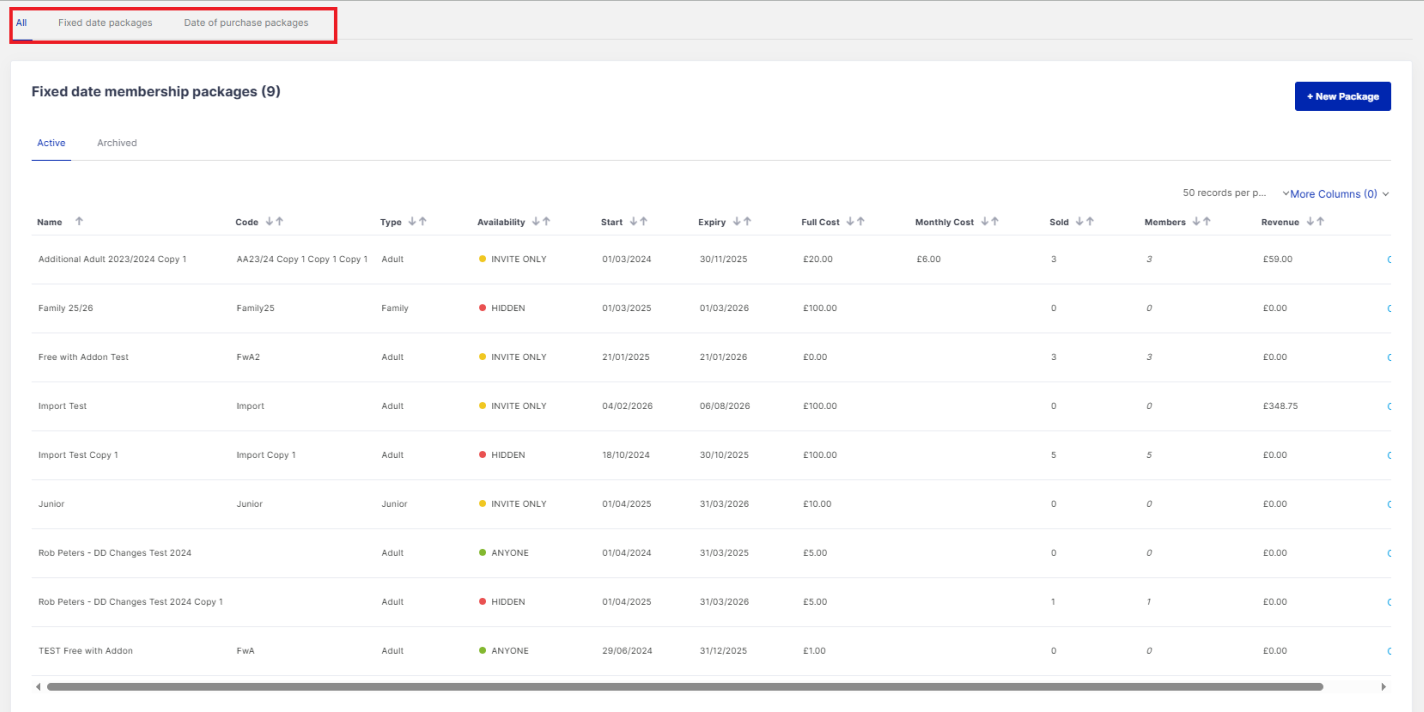 Step 2: Here you will see a list of your current membership packages. In the image below you can see that the packages are separated by 'Fixed date' and 'Date of purchase' memberships via the tab selection.