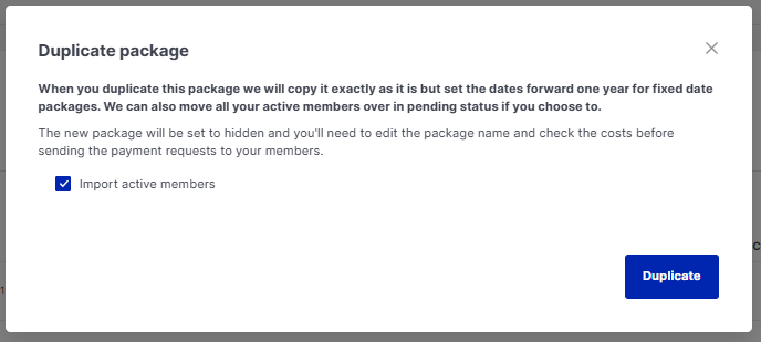 You have the option to import the active members at this point, by ticking the checkbox 'Import active members'. To create a duplicate package without importing the active members, untick this box before clicking on the blue 'Duplicate' button at the bottom of the overlay.