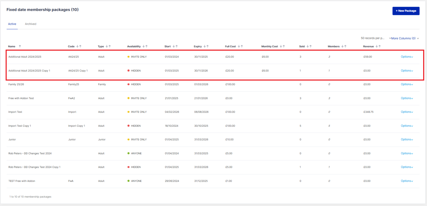 You can duplicate an existing membership package to create a follow on package from a previous year's fixed date package - or to replicate a package 'based on the date of purchase'.
