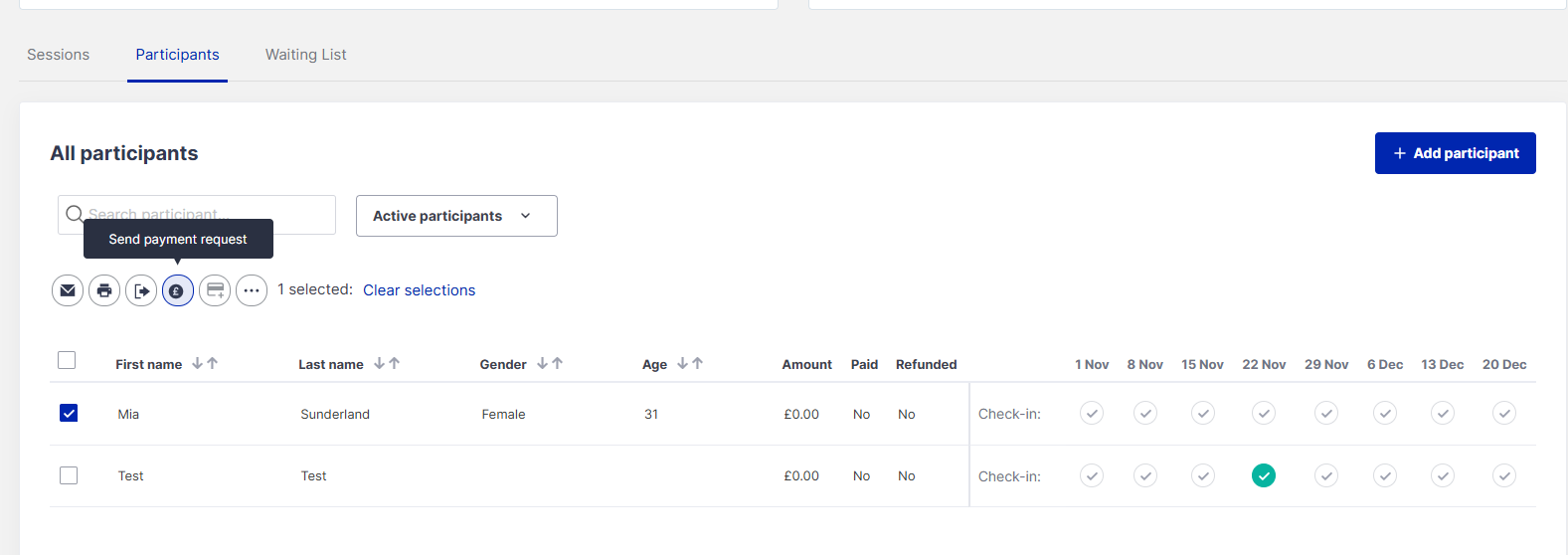 Step 2: You will then need to select the participants that you are sending a payment request to by ticking the box next to their name under the 'Participants' tab. If the participant is a junior, the payment request will be sent to their parent/guardian.