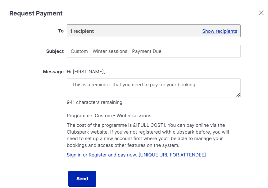 Please Note: You can only send a Payment Request if the course is set to Short course only. You can not send payment request for Recurring courses.