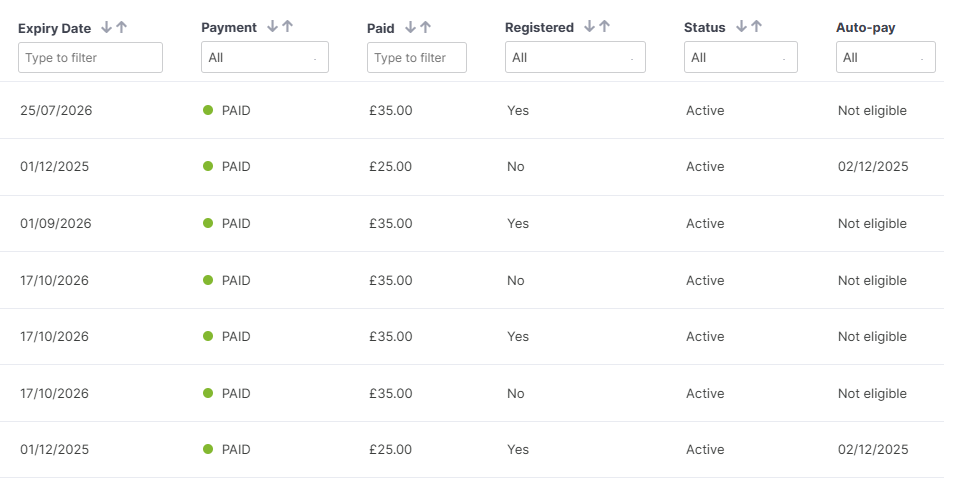 The 'auto-pay' column in the membership table displays who is eligible for an auto-renewal and the date they will be auto-renewed.