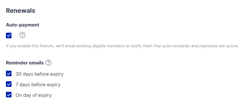 When enabled, eligible members who haven't opted out will be automatically renewed and have a Direct Debit payment processed on their renewal date.
