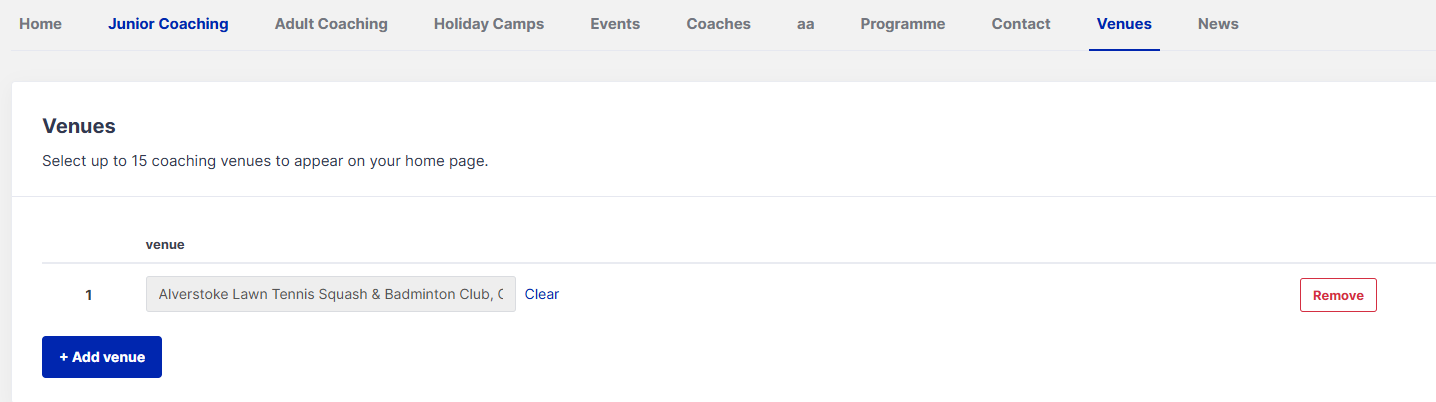 If you have a Coaching Organisation account, then you can add up to 15 venues to display on your coaching website to show where you coach as well as use when creating a coaching course.