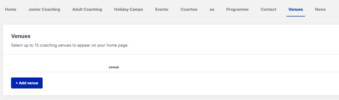 You'll first head to the Website Module within the admin area of your Coaching Organisation account. Once here you'll need to click on the 'Venues' Tab where you will see the following: