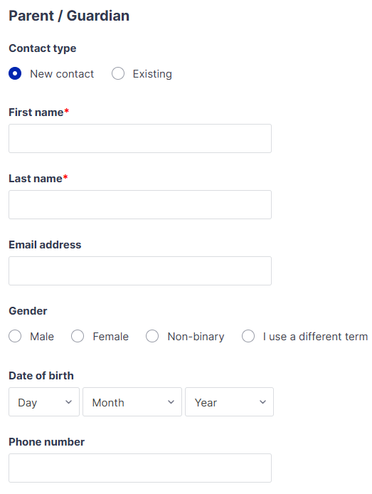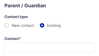 You'll then be taken to the following page where you'll need to first enter in the Parent/Guardian's details for the Junior player: If they are not already within your contacts, then you'll need to enter them as a 'New Contact'