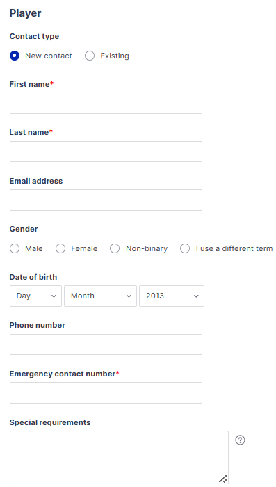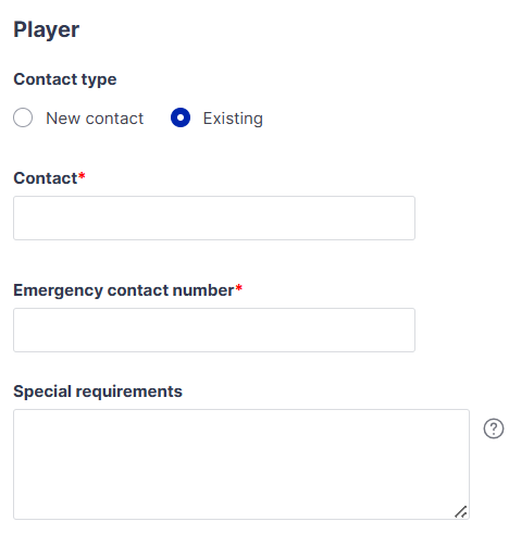 Next you'll need to add in the Junior player details: If they are not already within your contacts, then you'll need to enter them as a 'New Contact':