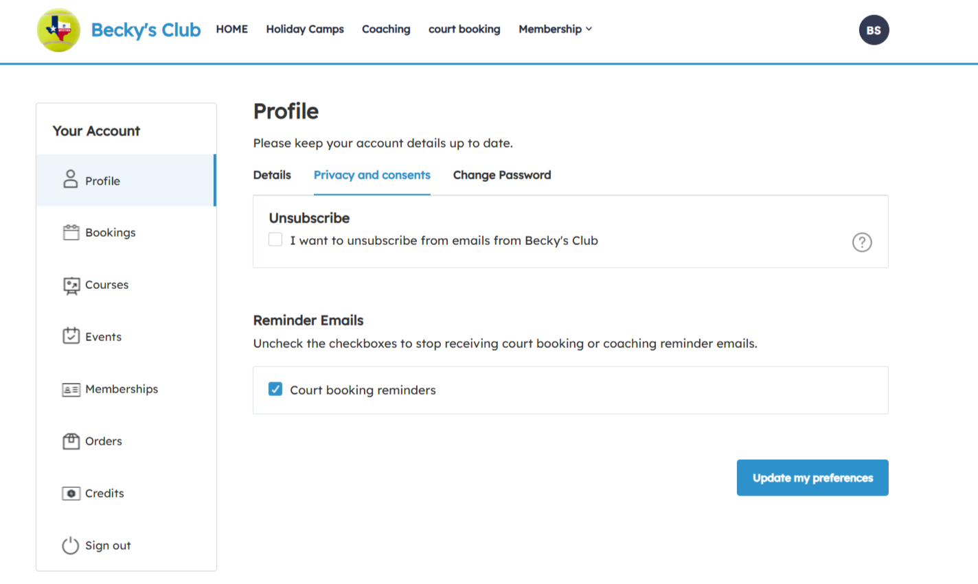 In this section you can unsubscribe from emails from your Tennis Club by clicking on the unsubscribe box. Note: If you choose to unsubscribe from emails you will still receive transactional emails such as booking confirmation. You are unsubscribing from the emails sent out from the club, i.e. club news, marketing etc.