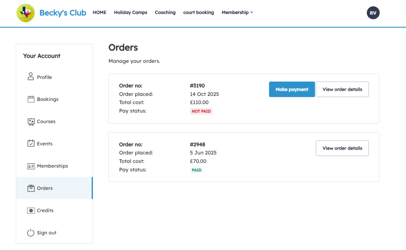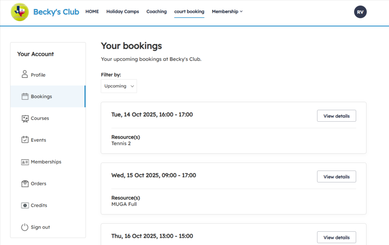 In this section you can view your upcoming bookings, you can cancel the bookings (if within the cancelation window set by your venue). You can also book another court.