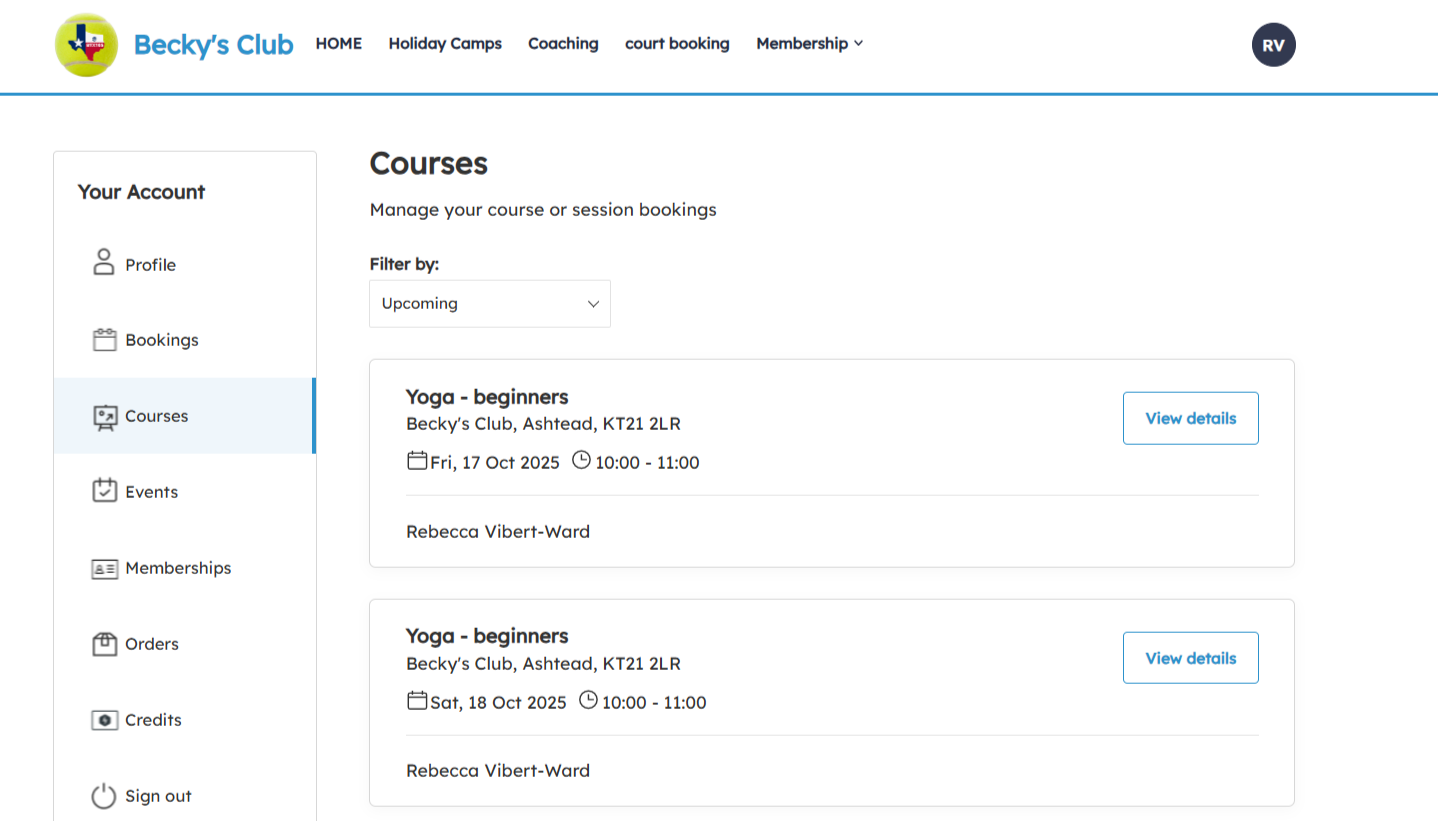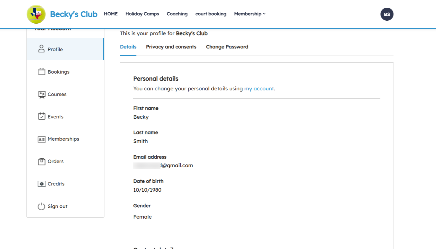 Your profile within ClubSpark will allow you to see your upcoming court bookings and courses. It will also show your memberships and allow you to edit your account details and edit your privacy and consents.