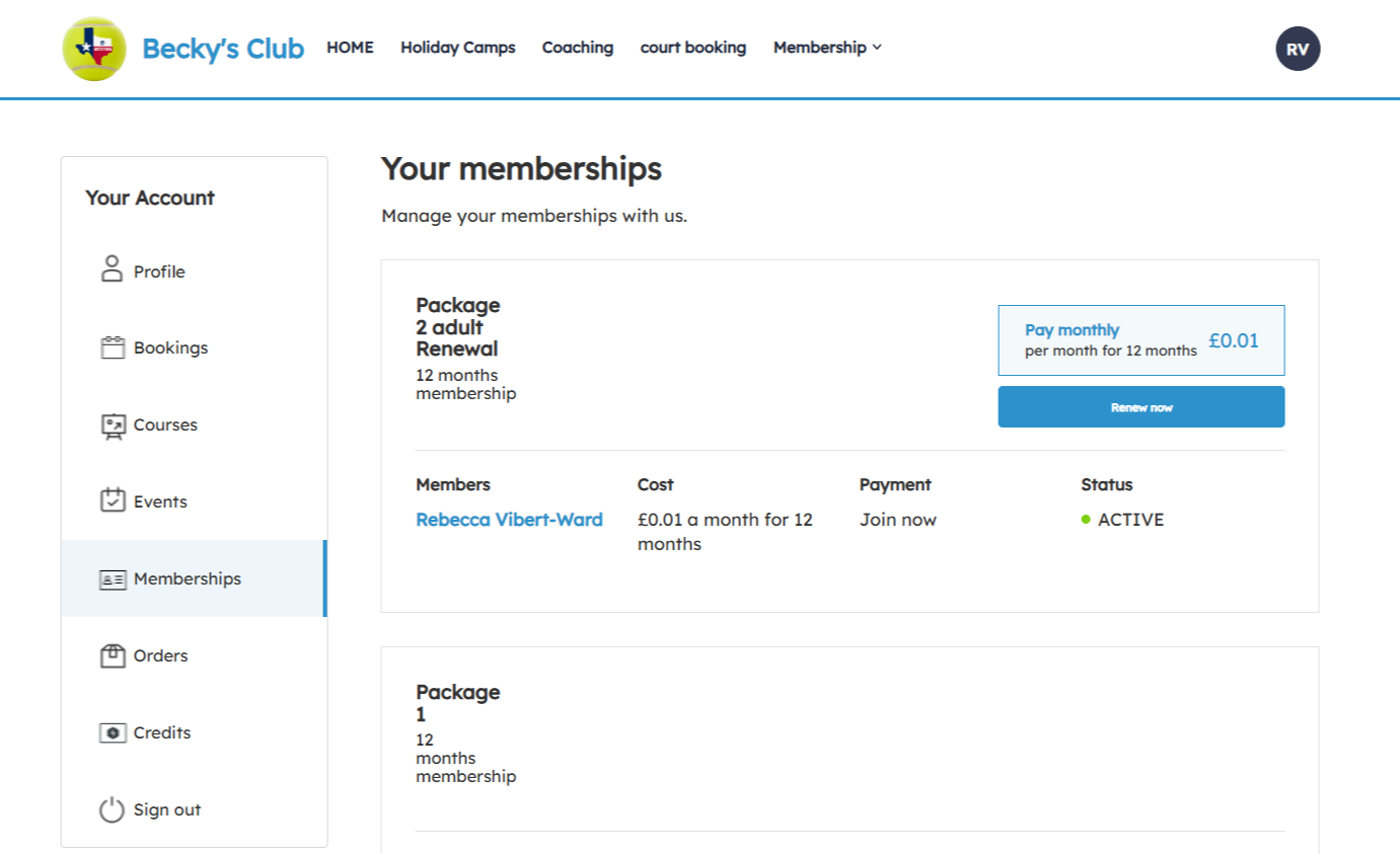 Here you can see you membership status. If you or a linked contact are due to renew, you can do that by switching user and then looking at their membership page.
