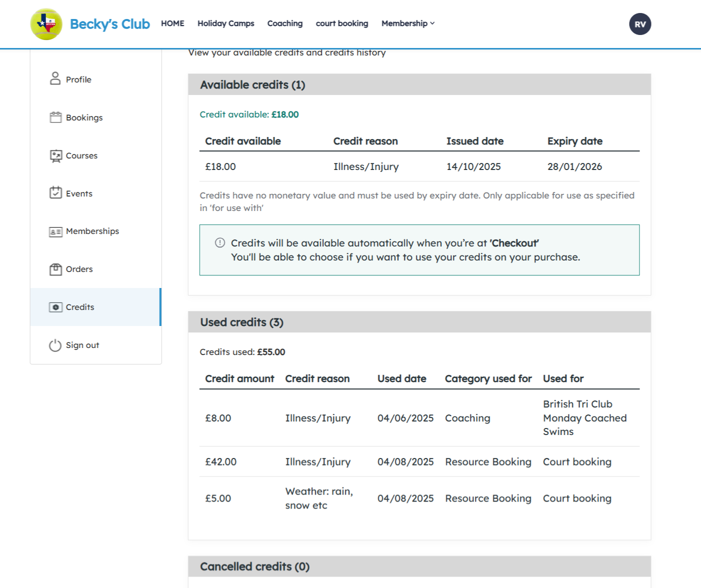 Here you can see your Credits that are available and used . To use your credits, if you have available credits, when you make a booking or reservation, this will be available to you to use.